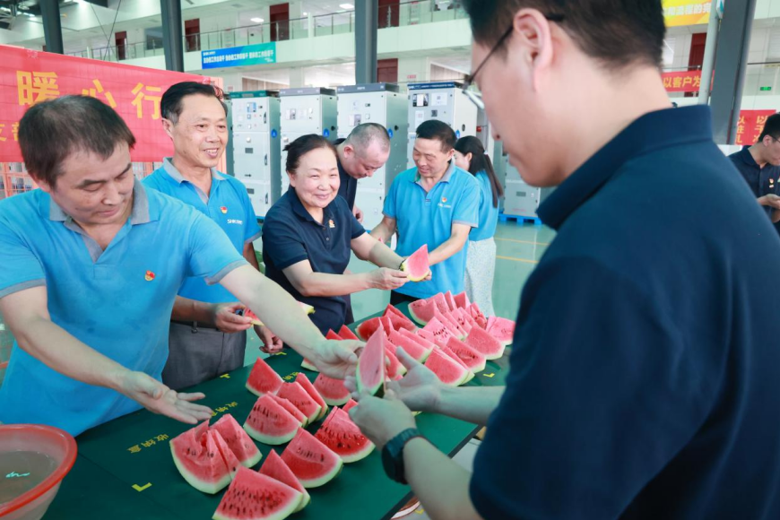 7月8日,炎炎夏日送关怀,350vip浦京电气党支部携手营销中心温情启动“夏日清凉送车间·情系一线暖心行”活动。营销中心领导及党员代表深入生产一线,为辛勤工作的员工们送上了西瓜、矿泉水、冷饮等降温物资,用实际行动传递组织的关怀与夏日的清凉,进一步增强了团队的凝聚力与向心力,让一线员工感受到了350vip浦京家的温暖与企业的深情厚谊。