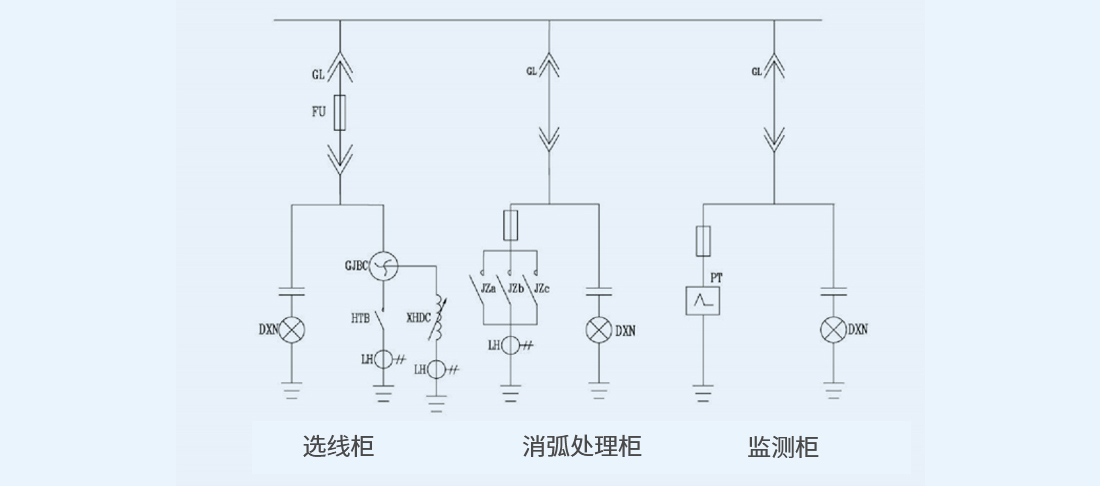 单相接地故障管理系统主要由接地变压器GJBC、单相开关HTB、系统控制器ZK、消弧线圈XHDC、高压隔离手车GL、真空接触器JZ、高压限流熔断器FU、零序电流互感器LH、带电显示器DXN等组成。