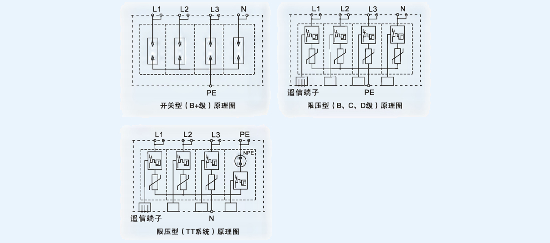 产品构成:分为箱式、模块式以及后备保护一体式三种,均采用非线性极好的限压元件。正常时高阻状态,过压时纳秒级导通限压泄流,随后恢复高阻。