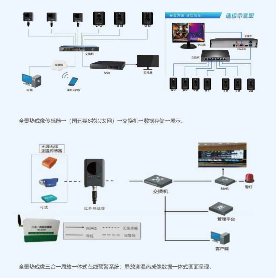 热成像固定式在线设备能够显示最高温度、平均温度;支持超温预警和前端多方式报警功能。