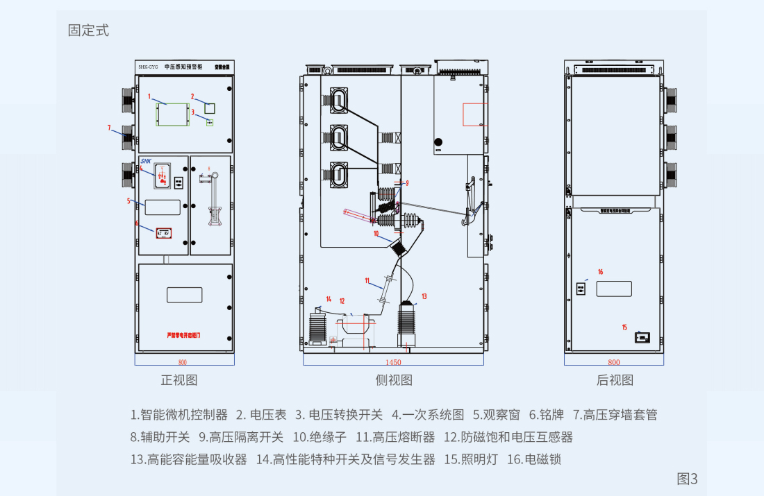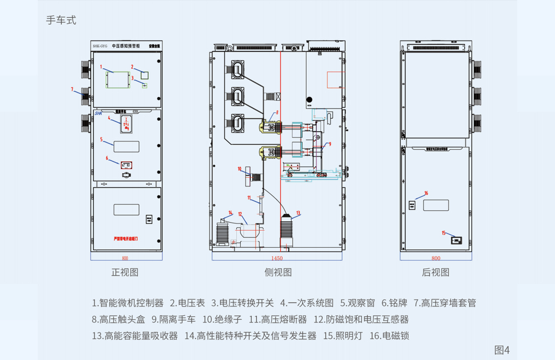 如图1、图2所示,SHK-GYG型中压感知预警柜由抗饱和电压互感器、信号注入直流解耦消谐装置、高能容能量吸收器、开关(隔离手车)、十寸超大屏智能工业控制器及西门子PLC控制系统等元件组成。